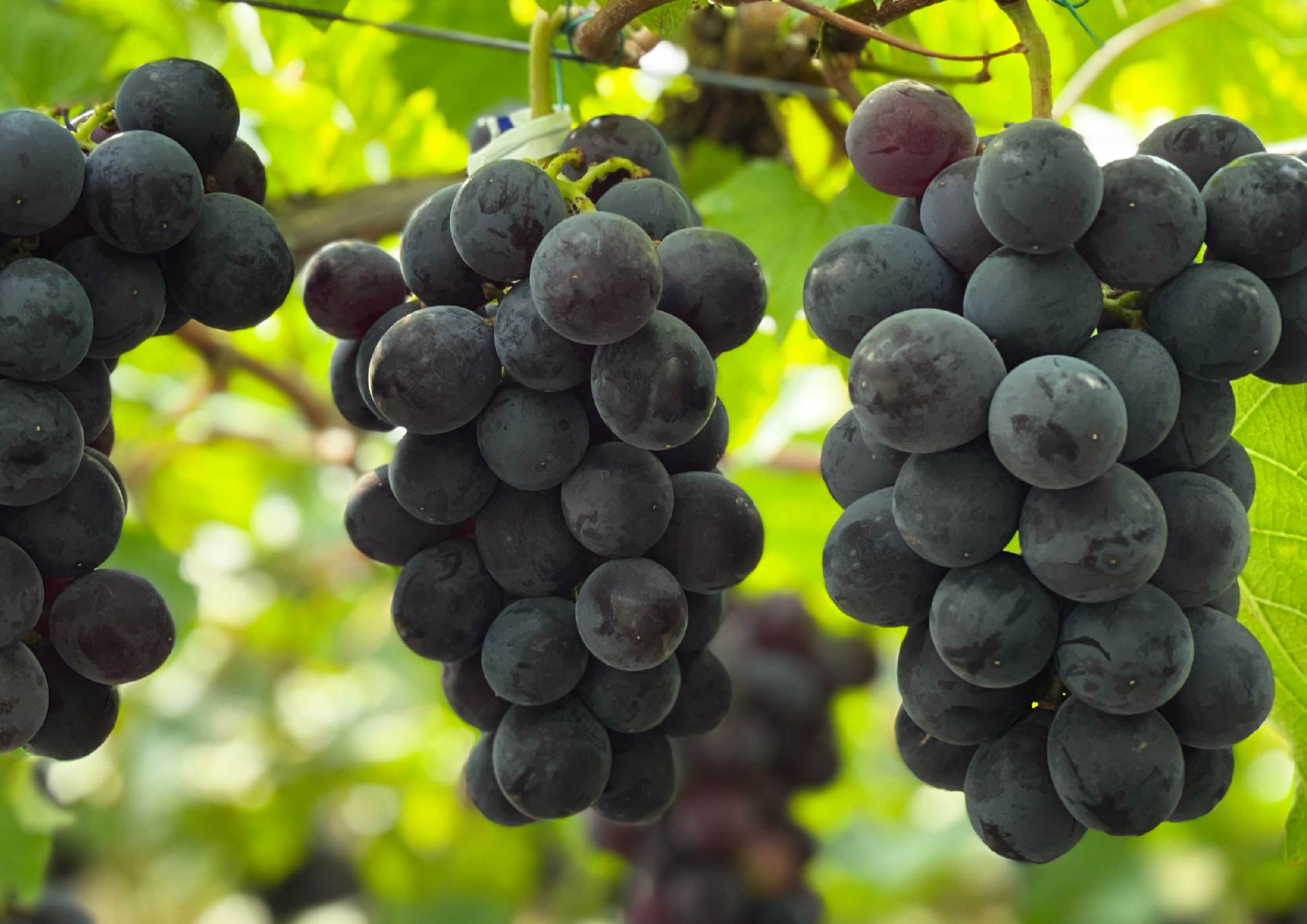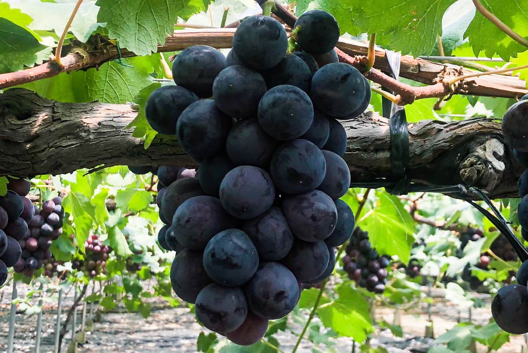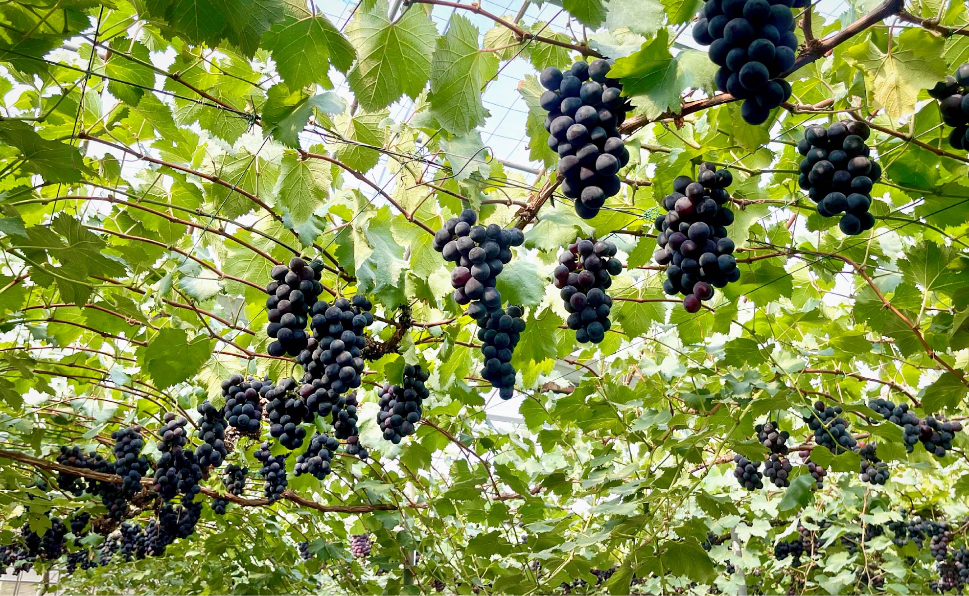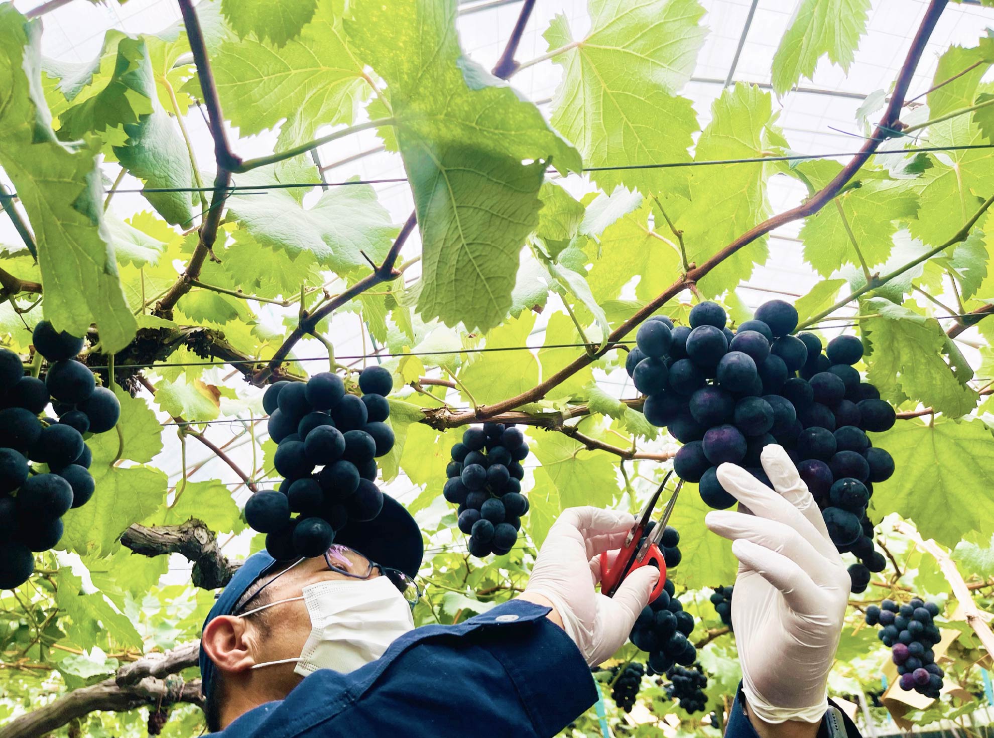 「岡本巨峰」は粒が⼤きく果汁たっぷりで濃厚な⽢みです。⻑年に渡って⼀番⼈気のぶどうです。 -